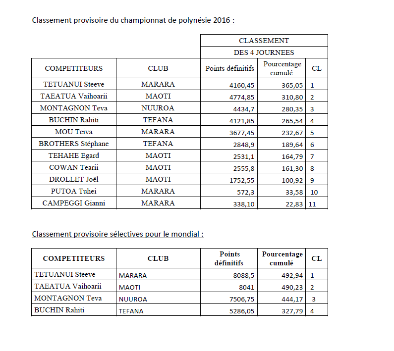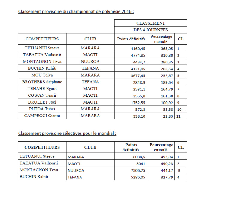 HITIA'A, le 28 avril 2016. (COMMUNIQUE) Les 3ième et 4ième manches du championnat de Polynésie de pêche sous marine se sont tenues samedi 23 et dimanche 24 avril dans les eaux de hitia’a entre Fa’atauti’a et le motu. Steeve TETUANUI et Vaihoarii TAEATUA ont respectivement gagné ces manches confortant de ce fait, leur place dans la sélection pour le mondial qui se tiendra au mois de septembre 2016 en Grèce. Si le poisson présenté était de qualité, les accroches poissons n’ont pas défrayé la chronique puisque sur les 2 journées, peu de pêcheurs ont passé la barre des 10 prises. Il est vrai que pour des raisons de sécurité, la Fédération avait opté pour des zones où l’eau était moins trouble mais aussi peu poissonneuse. Il n’empêche que ces 2 manches ont constitué un bel entraînement pour nos pêcheurs puisqu’ils ont du redoubler d’habilité et de persévérance pour trouver du poisson et lutter contre un fort courant notamment lors de la deuxième journée.