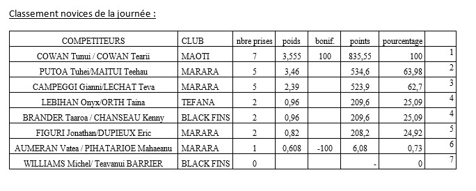 Pour 5 heures de compétition. La majorité des compétiteurs mise sur la balise rouge en plein face du quai de Faratea. Située à la limite de la passe, cette zone est une des plus poisonneuses du coin. Avec un peu de chance, on peut y trouver kuripo, karaua, papae... Steeve TETUANUI, sélectionné pour les mondiaux et son nouveau coéquipier Cédric TAPIERO, décident de ne pas traîner et de nager rapidement en direction de cette balise. malheureusement pour eux comme pour les autres ayant pris la même direction le poisson y sera aux abonnés absents. Les frères COWAN, heureusement pour eux, rebroussent chemin en voyant le nombre d’équipes qui descend sur la balise. Ils reviennent vers la bouée de départ et sortent 7 prises dont 1 bonifiée. la première place en novices leur est encore acquise.