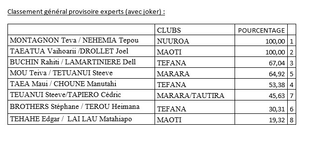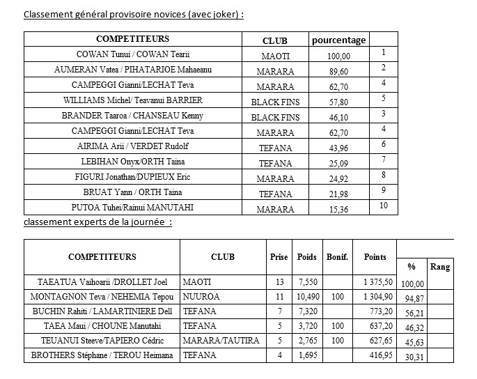Teva MONTAGNON et Tepou NEHEMIA resté en milieu de zone sont les seuls à sortir leur épingle du jeu sur cette zone en sortant 11 prises dont 1 gros mū bonifié. ils prendront la 2ième place de la journée.