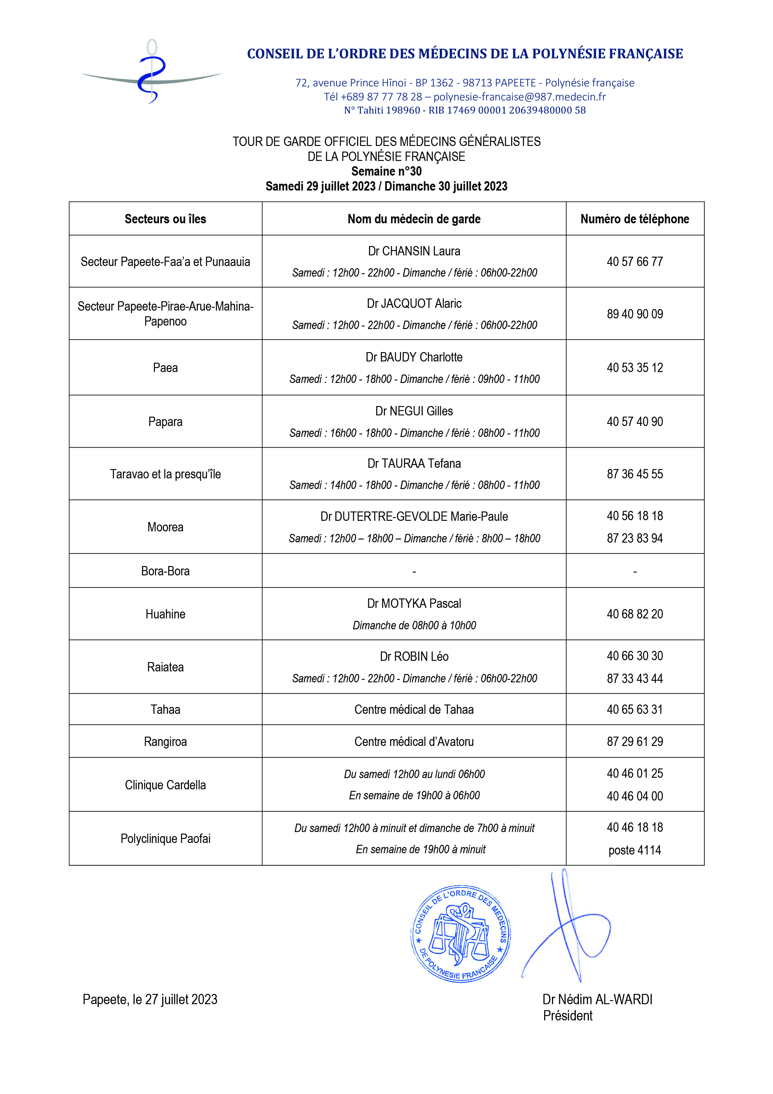 En cas de réelle urgence établie par une ordonnance du jour sur laquelle le médecin aura inscrit l'heure de la prescription, veuillez appeler la police municipale de Punaauia au 40 54 38 60