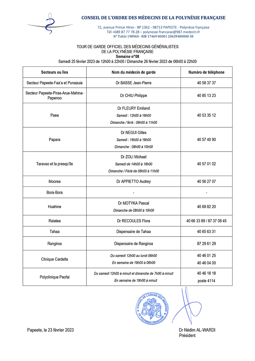 En cas de réelle urgence établie par une ordonnance du jour sur laquelle le médecin aura inscrit l'heure de la prescription, veuillez appeler la police municipale de Punaauia au 40 54 38 60