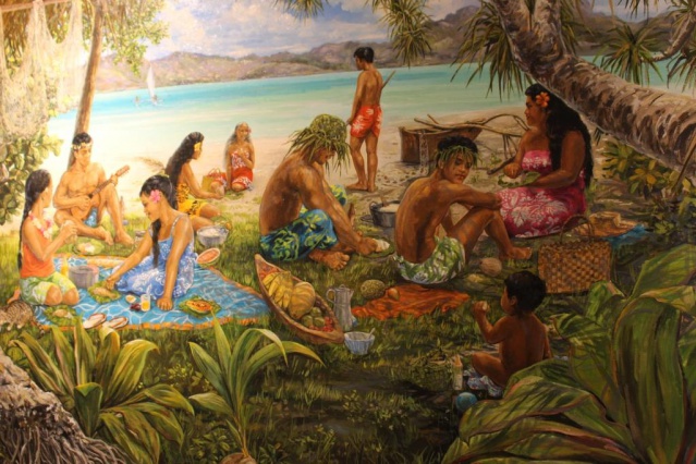 “De très nombreuses activités sont en lien avec l’eau en Polynésie, qu’il s’agisse de l’eau de la mer ou de l’eau des rivières”, décrit l’artiste-peintre Philippe Peltier. Il illustre ses propos en décrivant des scènes de pêche, de repos, de baignade, de tama’a. Pour s’exprimer, il utilise couleurs et pinceaux. Grâce à eux, il montre la vie des gens.