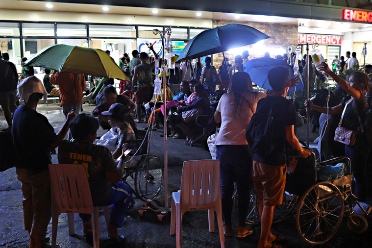 Dans la ville de Butuan, des aides-soignants ont évacué d'un hôpital des patients sur des brancards et des fauteuils roulants, leurs poches de transfusion intraveineuse suspendues à des pieds à perfusion.