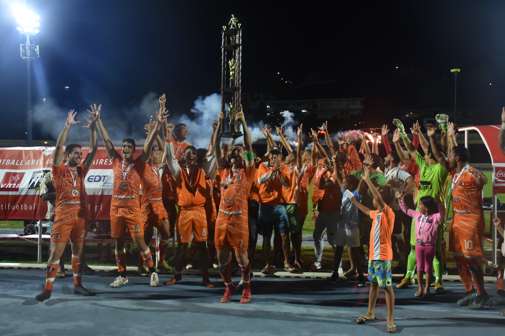 Raimana Li Fung Kuee et ses partenaires de Pirae qui ont soulevé le trophée de champion à l'issue de la rencontre.
