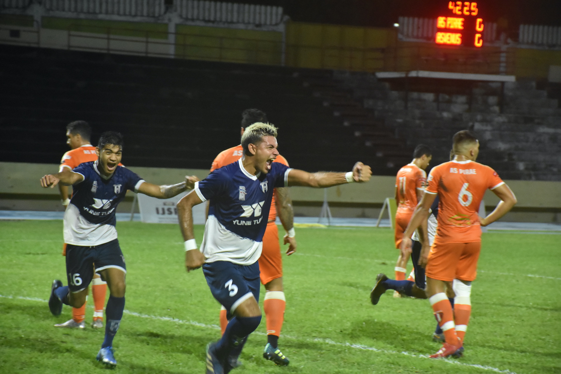 Tahiti, le 11 juin 2021 – Pirae reste le champion de la Ligue 1. Vendredi au stade Pater, les orange ont arraché dans le dernier quart d'heure le match nul face à Vénus (1-1), avec qui ils étaient à égalité de points au classement avant la rencontre. Grâce à une meilleure différence de but, les protégés de Naea Bennett décrochent un nouveau sacre.