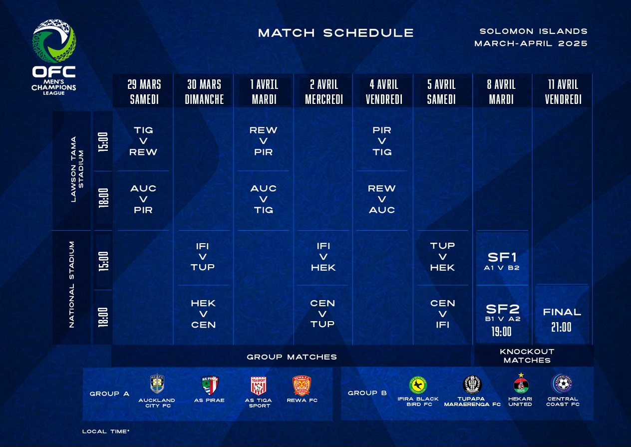 Dans l’autre poule, on retrouvera le Vanuatu avec l’Ifira Black Bird FC, les îles Cook représentées par le Tupapa Maraerenga FC, le club d’Hekari United de Papouasie Nouvelle-Guinée et, enfin, le club du pays hôte, les îles Salomon, le Central Coast FC, absent de la compétition depuis trois ans.