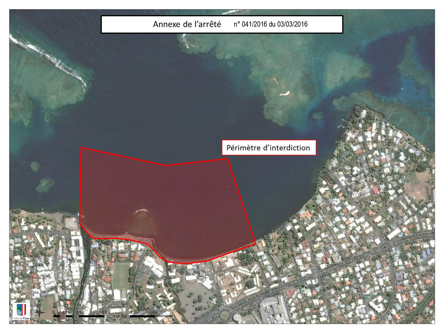 L'arrêté municipal pris le 3 mars dernier à Pirae matérialise sur une carte le périmètre d'interdiction, entre les deux embouchures de rivière. La plage de la baie du Taaone reste ouverte aux baigneurs.