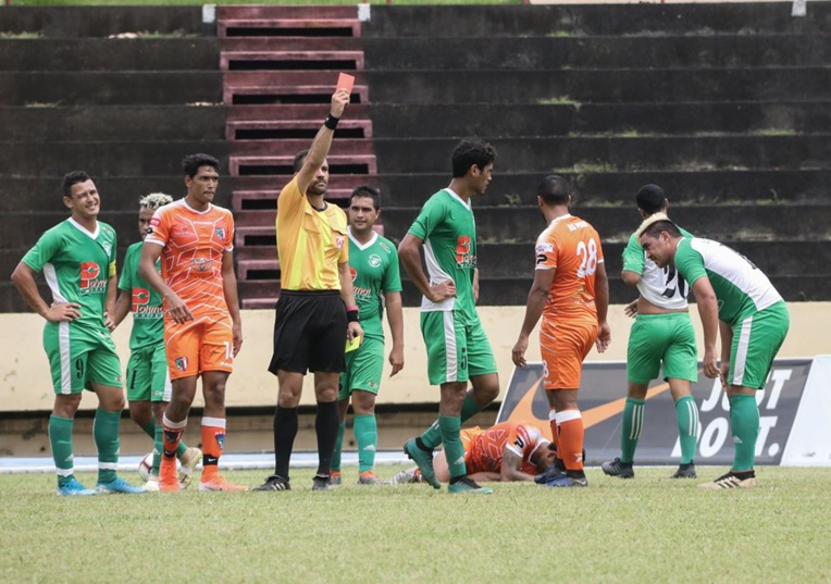 Nick Tauotaha, milieu de terrain de Tiare Tahiti, a été expulsé après la demi-heure de jeu. (photo : FTF)