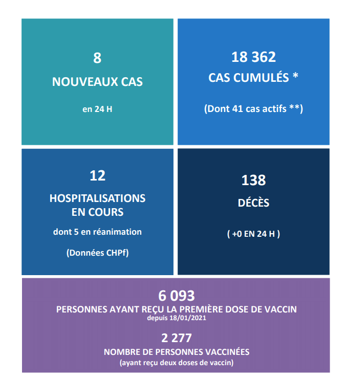 Tahiti, le 23 février 2021 – Le point épidémiologique, transmis ce matin par la direction de la santé, indique que 6 093 personnes ont reçu leur première dose du vaccin et que 2 277 ont reçu un traitement immunitaire complet avec deux injections. Concernant la pandémie, aucun nouveau décès lié au Covid-19 au fenua n’a été recensé au cours des dernières 24 heures. Le nombre de personnes victimes du coronavirus se porte à 138 en Polynésie depuis septembre dernier. On note également très peu de nouveaux cas de Covid-19, seuls huit personnes ont été diagnostiquées ces dernières 24 heures, tandis qu'on enregistre actuellement 41 cas actifs au fenua. Par ailleurs, seuls douze patients étaient encore hospitalisés ce mardi, dont cinq nécessitant un placement en service de réanimation.