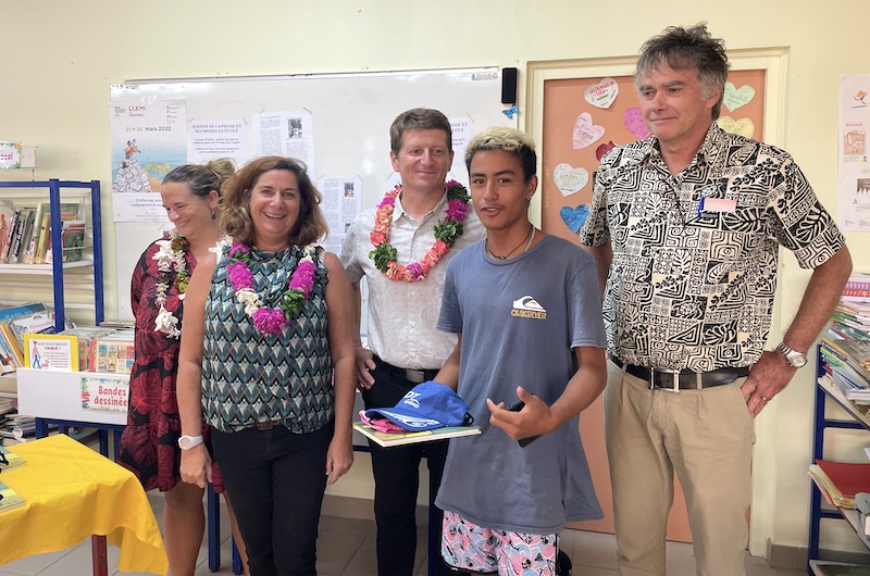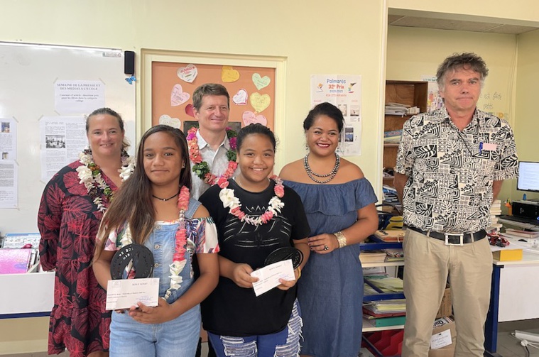 C'est dans la salle de documentation du collège de Hao, jeudi, qu'a eu lieu, en présence de deux inspecteurs du vice-rectorat de la Polynésie française, la remise des prix récompensant les élèves qui ont participé cette année à deux concours. Tout d'abord, les rencontres poétiques Henri Hiro, dont la première édition a eu lieu en 2017, ont été initiées pour inviter les collégiens à écrire et mettre en voix des créations poétiques personnelles. Il s’agit d’un concours de poésie, en langues française et tahitienne, conçu par les professeurs à destination des élèves. Il est sans restriction et est ouvert à tous les collèges, publics et privés. Chaque établissement peut inscrire deux élèves par classe, un en français et un en tahitien. Pour un professeur, la participation à ces rencontres est l’occasion d’engager en classe des activités autour de la poésie et d’encourager la lecture et l’écriture. Cette année, le collège de Hao a présenté deux éléves : Nadvège, élève de 4e, pour le poème en tahitien et Tevahine, élève de 5e, pour celui en français. Leurs créations portaient sur le thème du sourire. Chacune a remporté un prix dans sa catégorie.