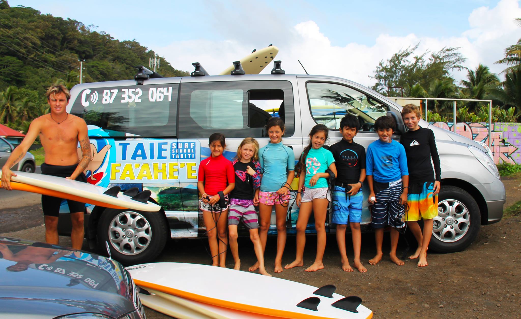 « Je remercie toutes les personnes qui m’ont aidé de près ou de loin à démarrer mon aventure. Tout précisément mon beau-père Henri Mongarde qui m’a donné l’envie de croire que c’était possible ! Un grand Mauruuru à ma chérie qui, quand je pars, gère l’école pour moi et qui me conseille toujours pour prendre les meilleures décisions. Merci aussi à Niko Richard de « Plug Bodyboard Pro Shop » avec qui nous sommes partenaires et qui me fournit du matériel de bodyboard haut de gamme pour l’école. Enfin, John Poileux, allias HTJ designs, qui m’a énormément aidé pour toute la partie graphique et communication.