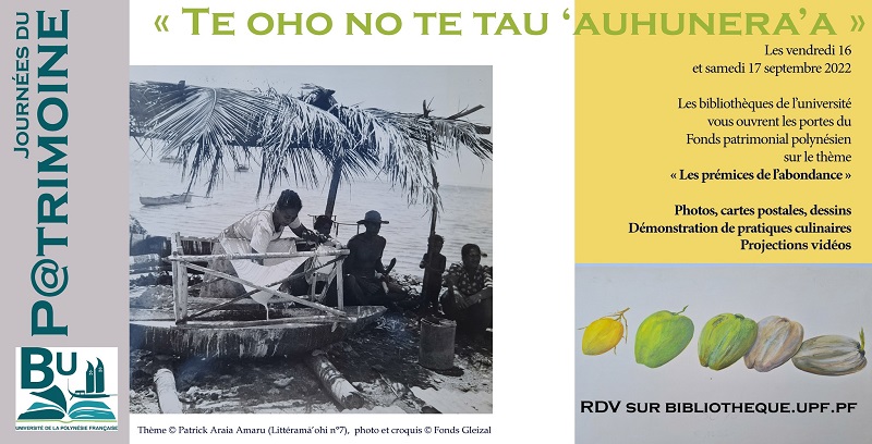 Les Journées du patrimoine se dérouleront vendredi et samedi. À cette occasion, la bibliothèque de l'Université de la Polynésie française organise des visites du Fonds patrimonial polynésien, un fonds d’études, de recherche et de conservation rassemblant ouvrages, documents et iconographies relatifs au triangle polynésien publiés dans le monde entier. Le thème retenu cette année par l'UPF pour ces journées est “Te oho nō te tau ‘auhunera’a, les prémices de l'abondance”, en hommage à l’ouvrage de Patrick Araia Amaru. Le public pourra alors découvrir d'anciennes photos, cartes postales, dessins, gravures, lithographies et projections vidéo valorisant la nature, la faune et la flore, le rāhui, ou encore des scènes de vie du marché de Papeete de l’époque. Les visiteurs pourront également découvrir la bibliothèque numérique et scientifique polynésienne Ana’ite, qui comprend des œuvres comme une esquisse de mangues par Boullaire ou encore une scène de préparation du lait de coco, issue du fonds documentaire de l’ancien éditeur Christian Gleizal qui a rejoint récemment les collections de la bibliothèque de l’UPF.