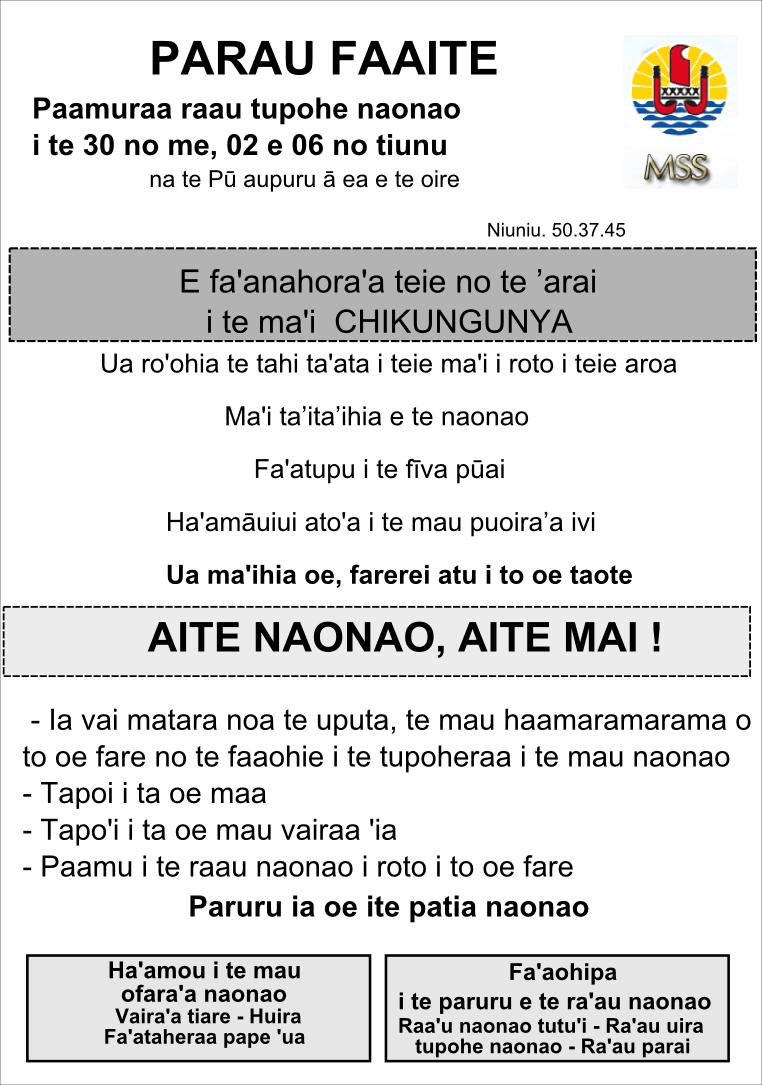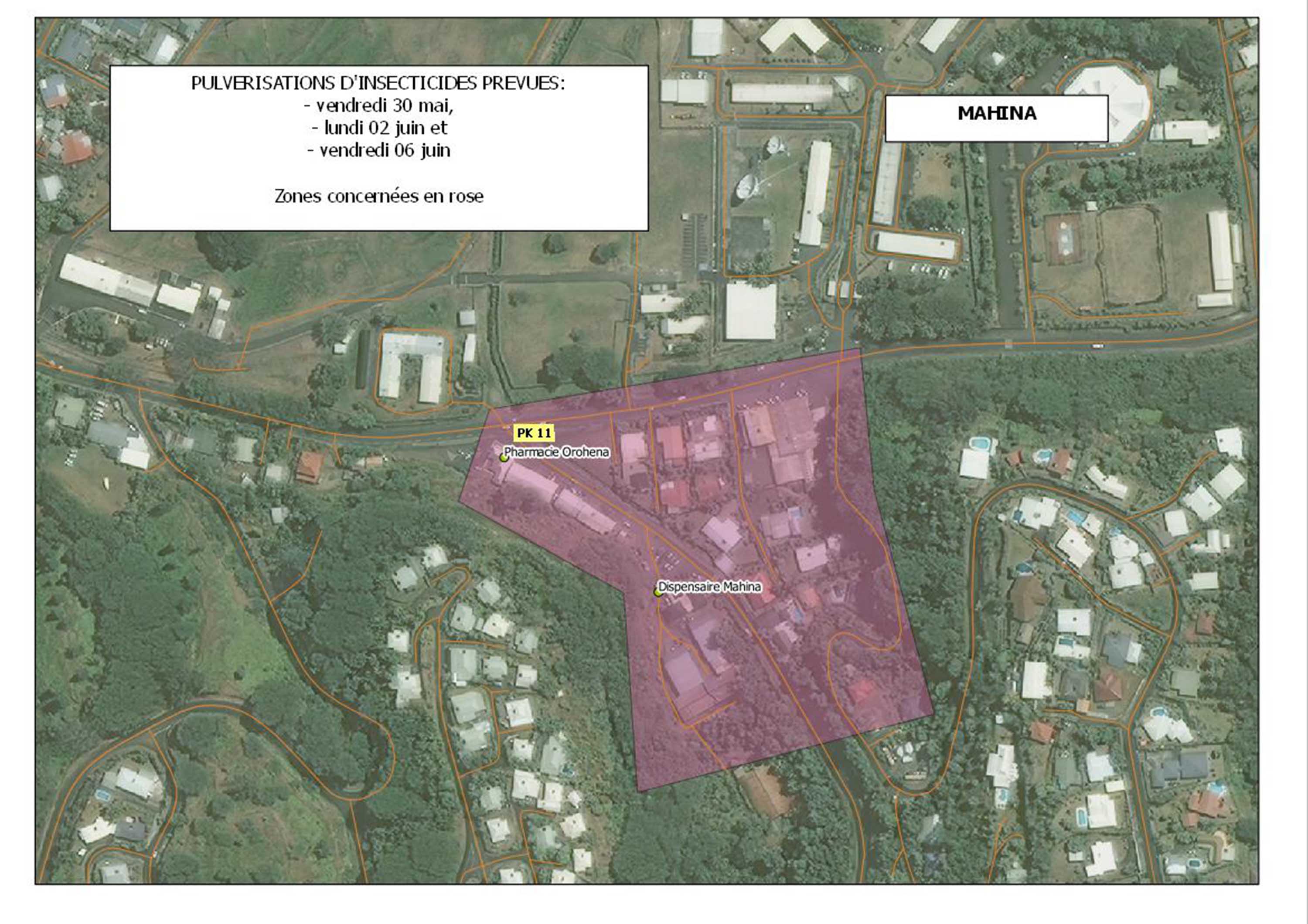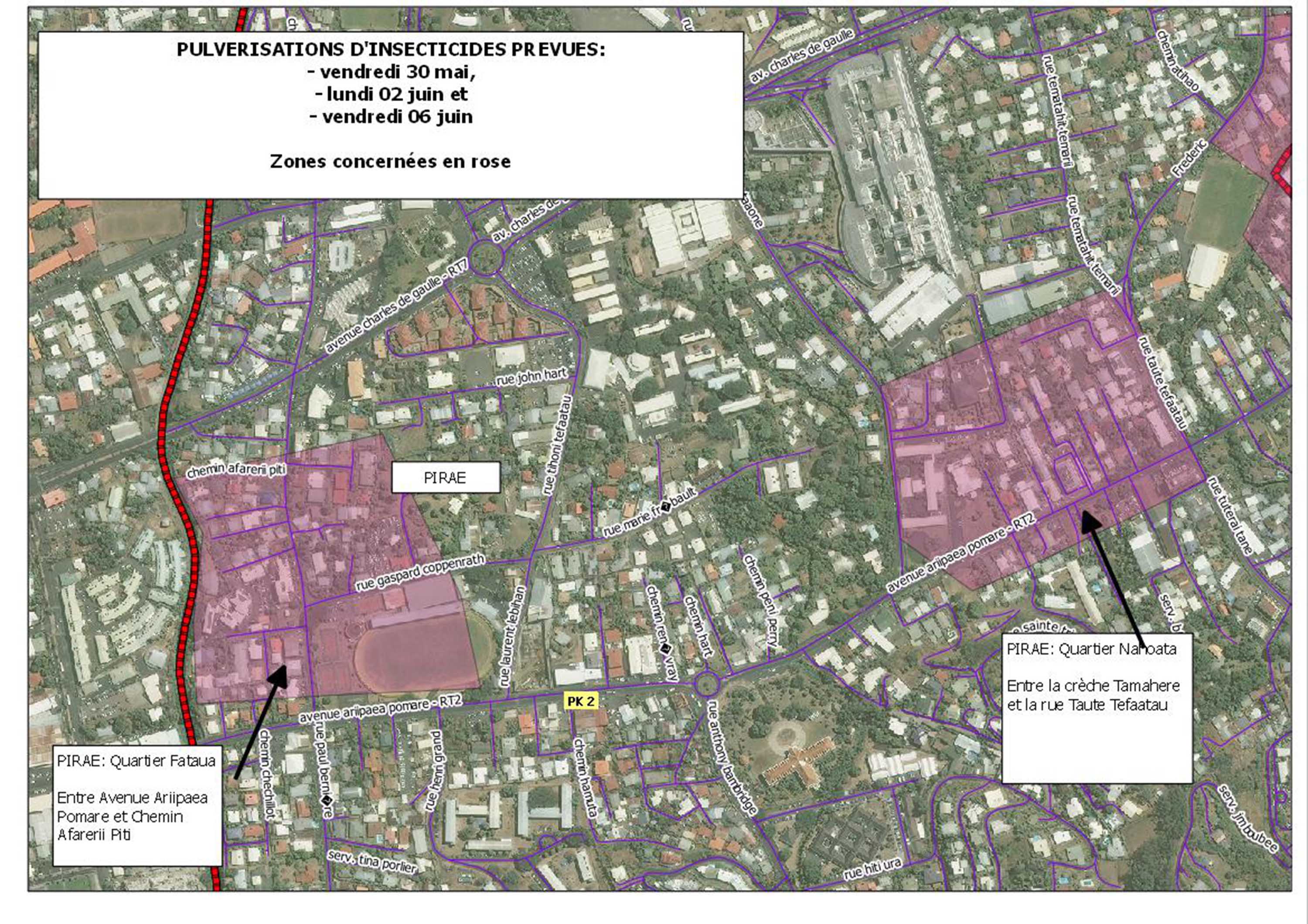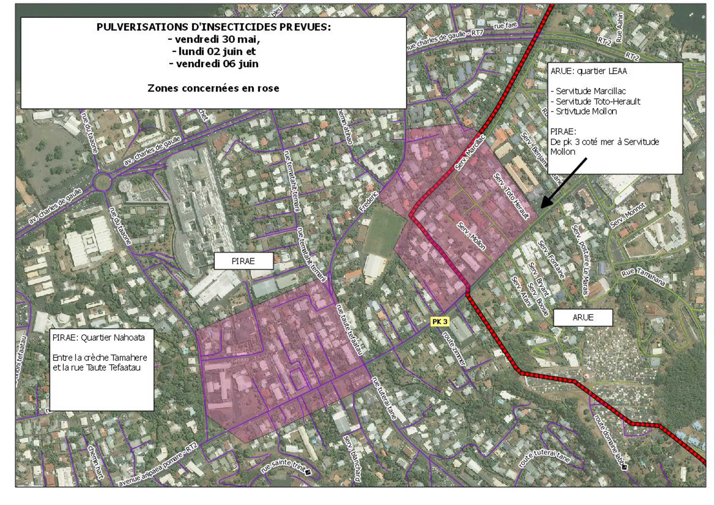 Les autorités sanitaires ont décidé de mettre en œuvre une campagne de pulvérisation ciblée à Pirae, Arue et Mahina, les vendredi 30 mai, lundi 3 et vendredi 6 juin. (voir illustrations jointes)