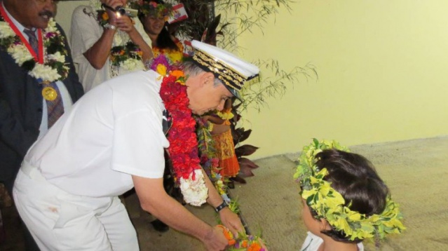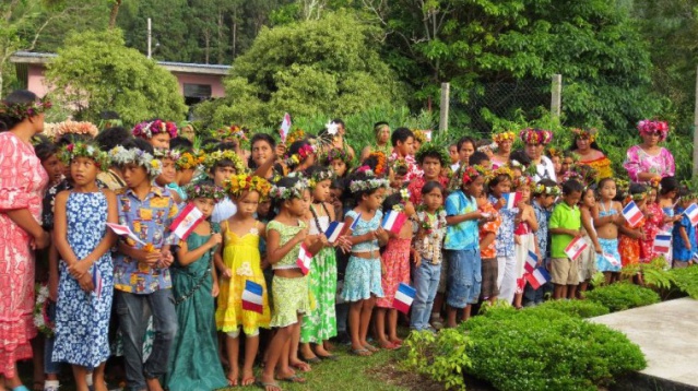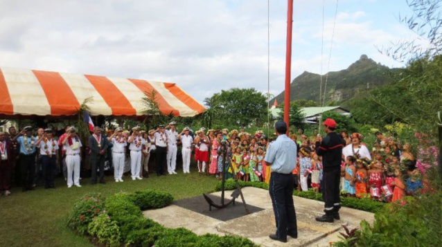 Les enfants de l’île lui ont offert une interprétation exceptionnelle des hymnes polynésien et national, lors de la cérémonie de levée des couleurs et en présence, d’un piquet d’honneur de l’« Arago ».