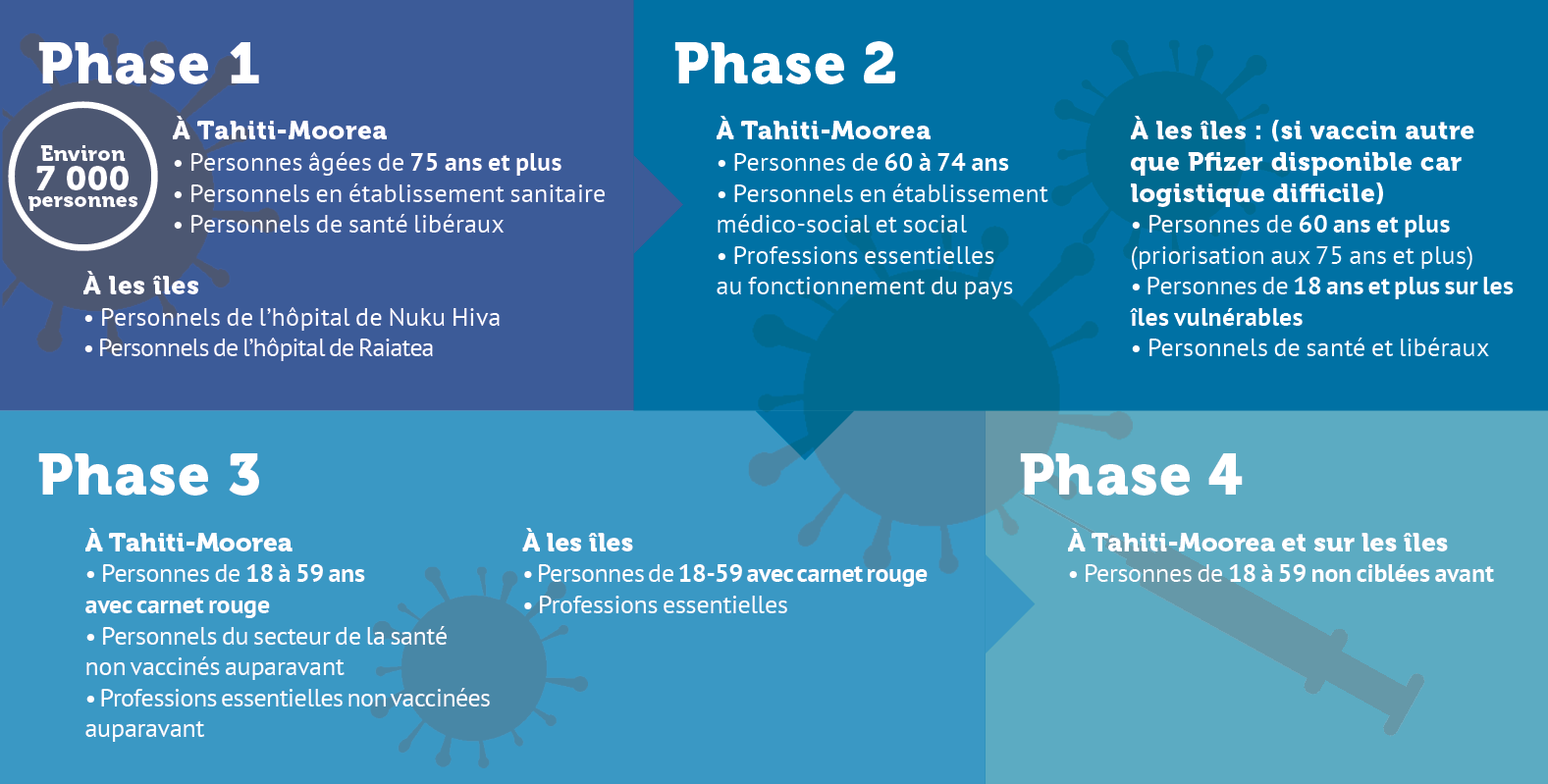 Dans le monde, plus de 16 millions de personnes ont déjà reçu un vaccin contre le Covid-19, dont près de 5 millions aux États-Unis. En Polynésie, les 15 000 premières doses doivent permettre de vacciner près de 7 000 personnes. "Nous avons déjà beaucoup d'appels, y compris de personnes qui ne sont pas dans la population cible de la phase 1, indique Jacques Raynal. Mais il est évident que nous allons privilégier les personnes à risque de plus de 75 ans et ceux qui sont atteints de pathologies lourdes ainsi que les soignants, qui sont intégrés au fur et à mesure dans le dispositif".