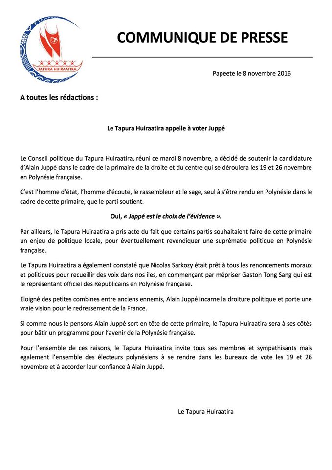 "C'est l'homme d'Etat, l'homme d'écoute, le rassembleur et le sage, seul à s’être rendu en Polynésie dans le cadre de cette primaire, que le parti soutient", explique dans son communiqué le Tapura Huiraatira, un parti présidé par Edouard Fritch lui-même.