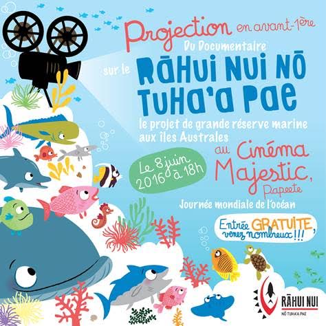 PAPEETE, le 7 juin 2016 - Demain, mercredi 8 juin, sera la Journée mondiale de l'Océan. Pour l'occasion, le documentaire de 26 minutes tourné aux Tuha'a Pae par Jacques Navarro, "Le grand Rahui des Australes", sera projeté gratuitement à 18h au cinéma Le Majestic à Papeete.