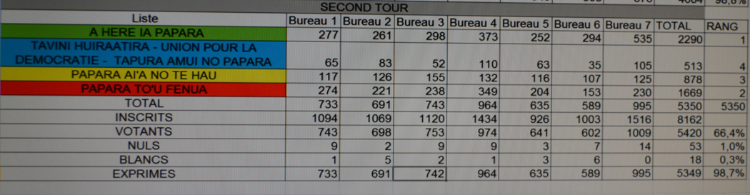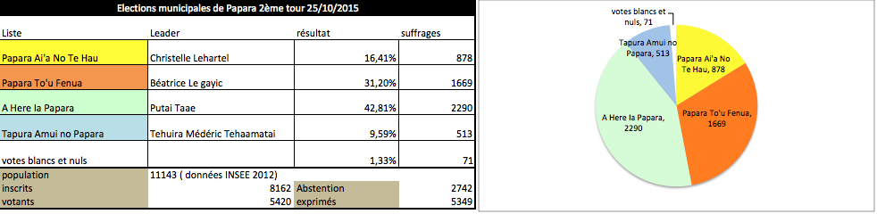 PAPARA, le 26 octobre 2015. La liste A Here ia Papara menée par Putai Taae a remporté avec une avance confortable le second tour des élections municipales de Papara hier soir. Il l'emporte avec un total de 2290 voix, contre 1669 à sa poursuivante Béatrice Le Gayic. Il siégera au conseil municipal avec une majorité de 24 élus sur 33.