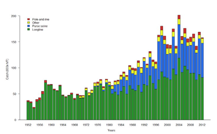 On entend souvent que la pêche à la palangre (à l’hameçon) est une pêche écologique. En effet, cette technique ne cible que des individus matures, qui ont généralement eu le temps de se reproduire avant d’être capturés. Elle est donc beaucoup plus respectueuse pour les stocks que la pêche au filet maillant moins sélective. Cependant, on ne peut pas pour autant considérer que la palangre est une pêche écologique. Selon la CPS, la palangre est responsable des deux tiers de la surexploitation du thon obèse dans le Pacifique (voir la figure 3) et de 95% de la pêche du thon germon. Elle reste donc la technique de pêche qui a l’impact le plus important sur les stocks de thon (hors bonite) du Pacifique. On entend aussi souvent localement que la pêche à la palangre est automatiquement certifiée par un label de pêche durable de type MSC. C’est faux. La production de certaines espèces, comme le germon et le thon jaune, peut être certifiée, mais seulement si l’effort de pêche est jugé durable. Par contre, la production du thon obèse, même à la palangre, ne peut pas être certifiée car cette espèce est déjà surexploitée.
