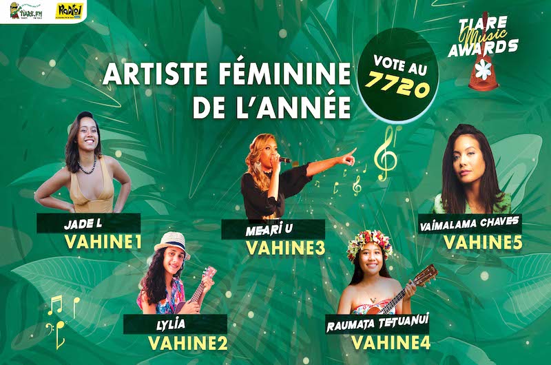 Votez dès maintenant pour votre artiste féminine de l'année par SMS au 7720 ou en ligne sur les sites de Tiare FM et Radio 1. Les votes seront clôturés le 18 mars. L'événement est prévu pour le samedi 19 mars à l'hôtel Le Tahiti by Pearl Resorts à 18 heures.
