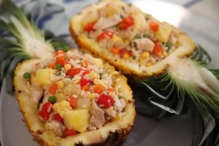 1 / Faites cuire le riz. Creuser l'ananas et prélever la chair. Coupez le en cubes. Réservez l’écorce pour la décoration.