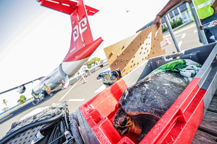 "J'ai décidé de rapatrier la tortue sur Tahiti", explique le représentant de la Diren. "En voyant son état, il était clair qu'elle avait besoin d'un vétérinaire." Aussitôt dit, aussitôt fait. La tortue, après avoir été pesée sur le tapis roulant de l'aéroport de Rangiroa (33,9 kg, tout de même), a profité du prochain vol vers Papeete et s'est envolée pour pouvoir bénéficier au plus vite des soins appropriés à Tahiti.