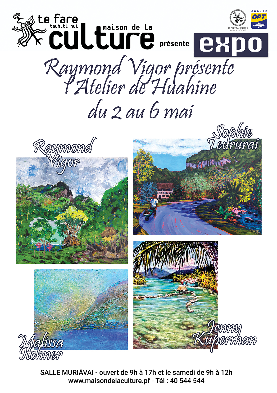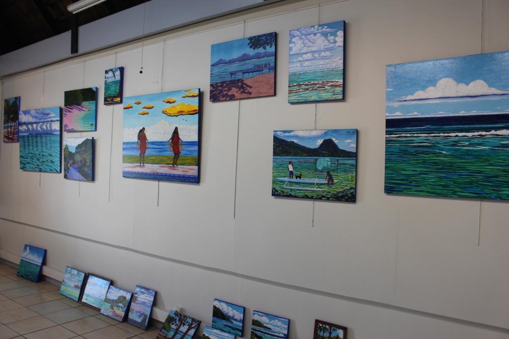 L’atelier de Huahine est un collectif de trois peintres de Huahine, Sophie Teururai, Mataaiai (Malissa Itchner) et Jeny Kuperman et de Raymond Vigor. Lui est basé à Tahiti, mais il se rend régulièrement sur l’île des femmes pour créer (lire aussi cet article. "J’ai pour habitude de peindre sur le motif, je m’installe dehors et, lorsque Sophie, Mataaiai et Jeny m’ont vu, elles ont décidé de me suivre." La première fois, c’était il y a cinq ans. Depuis, les quatre peintres œuvrent ensemble lorsque Raymond Vigor séjourne à Huahine. "J’expose régulièrement salle Muriāvai", dit Raymond Vigor. "J’ai souhaité donner une opportunité et plus de visibilité à l’atelier de Huahine cette année car Sophie, Mataairai et Jeny ne trouvaient pas de salle."