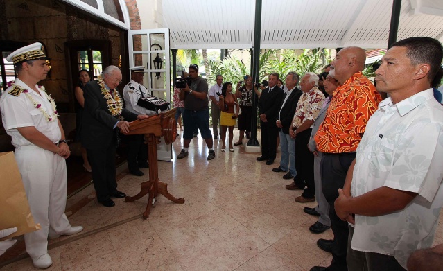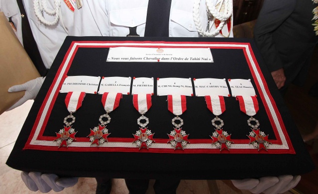 C’est pour vous remercier de cet engagement au service du Pays, et récompenser une carrière exemplaire, que j’ai le plaisir et l’honneur de vous élever au rang de chevalier dans l’ordre de Tahiti Nui. "