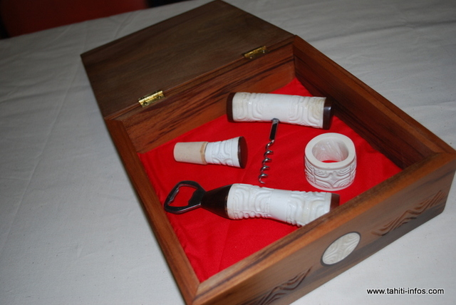 Patente tout art et son coffre à vin sculpté comprenant un tire-bouchon, un bouchon en os et bois