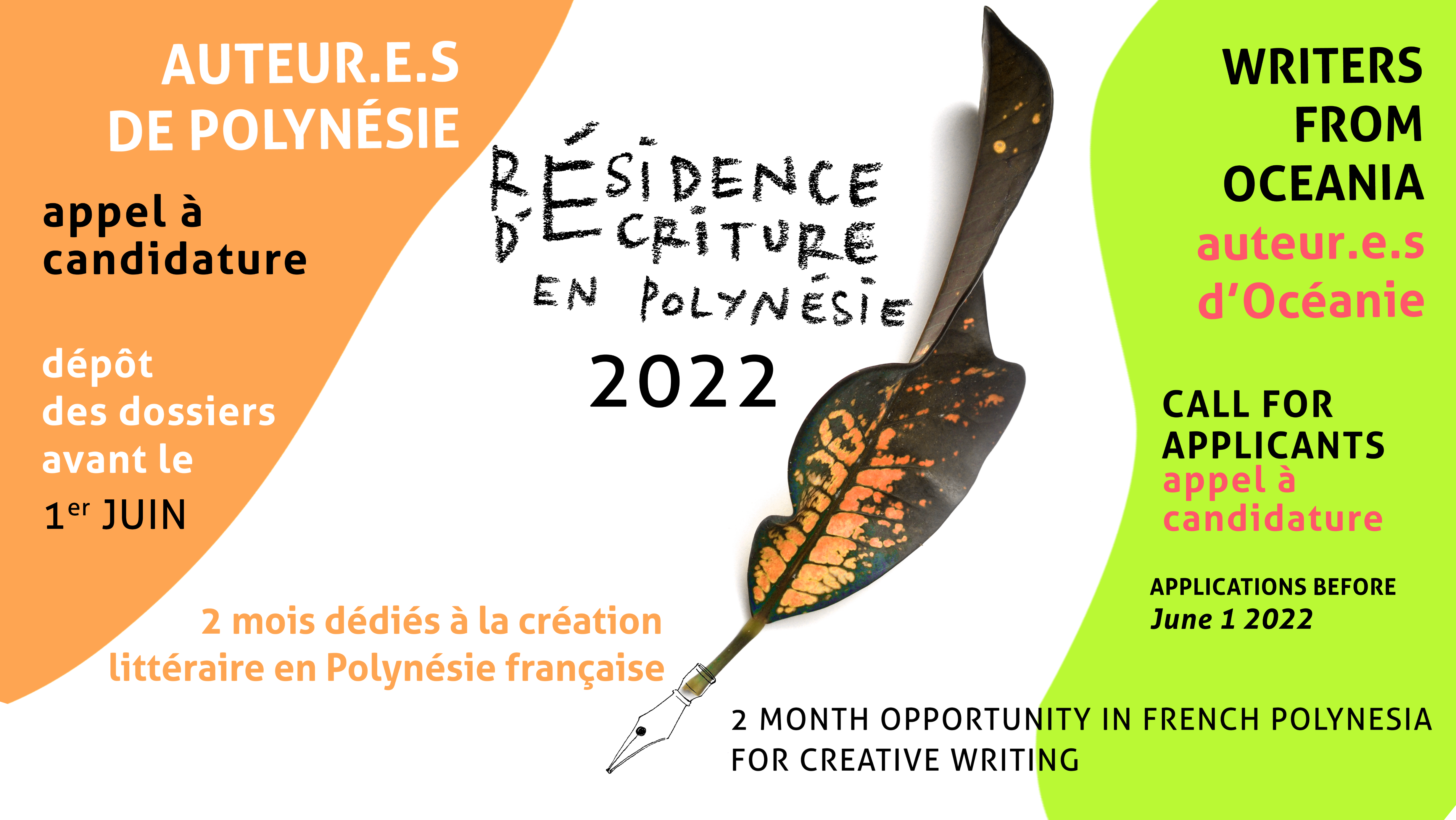 Tous les auteurs du bassin océanien (Pacific islands, Papouasie Nouvelle-Guinée, Australie, Nouvelle-Zélande, Hawaii, Nouvelle-Calédonie…) et de Polynésie française (résidents ou natifs) ayant déjà publié et ayant un projet d’écriture en langues française, anglaise ou autochtones (littérature, poésie, théâtre, littérature de jeunesse) peuvent répondre à l’appel qui vient d’être lancé par l’Association des éditeurs de Tahiti et des îles (AETI). Ils pourront bénéficier d’une immersion de deux mois dans une île polynésienne pour se consacrer à leur projet.