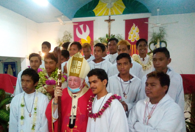 76 confirmations, 14 communions et 5 baptêmes ont été célébrés ce week-end par Monseigneur Cottenceau à Hao.