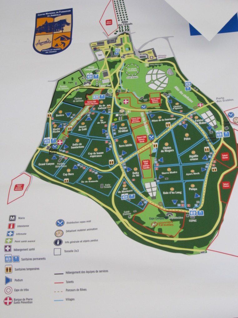 Le parc de Jambville a été acquis par les scouts de France il y a 60 ans. Il recouvre 52 hectares. Il a été divisé en "Villages" accueillant les enfants de chaque pays présent sur le site. Sur place, bien entendu, des équipes de la sécurité civile, des médecins... Les enfants de Tahiti étaient répartis sur les espaces "Cap de bonne espérance" et "'piton de la fournaise" (voir carte). Ils ont planté leurs tentes sous les bois, et les bons campeurs que sont nos jeunes polynésiens ont déploré de n'avoir pas pu mieux sélectionner leurs terrains: "certains ont été contraints de planter leur bivouac dans des cuvettes et dès qu'ils s'est mis à pleuvoir, forcément, ils se sont retrouvés inondé! mais ça fait partir de l'expérience, même s'ils ont eu un peu froid..." sourit André Chuong.