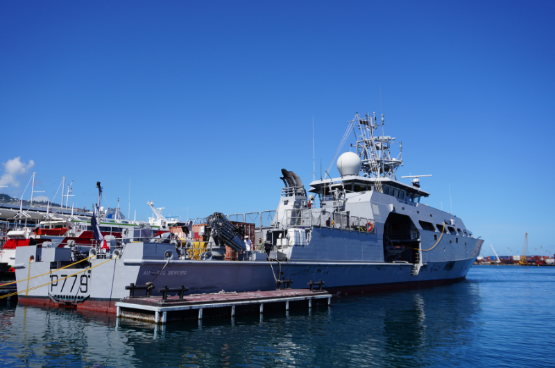 Tahiti le 16 mars 2023 - L’Auguste Bénébig a accosté ce mardi à Papeete avant de rejoindre Nouméa lundi. 80 mètres de long, un canon téléopéré, quatre mitrailleuses, un drone militaire embarqué : affecté à la surveillance des zones maritimes, ce type de navire doit progressivement remplacer les anciens patrouilleurs des territoires ultramarins.