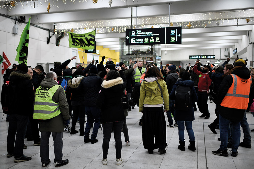 Paris, France | AFP | mardi 24/12/2019 - "Fêter Noël entre grévistes": à l'approche du réveillon, les cheminots opposés à la réforme des retraites multiplient mardi les actions pour maintenir la mobilisation, qui a occasionné à la SNCF un manque à gagner de 400 millions d'euros.
