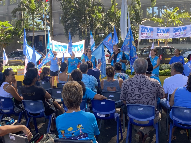 Le secrétaire général d'UNSA éducation, Thierry Barrère face aux manifestants, ce jeudi, devant le monument aux morts de l'avenue Pouvana'a a Oopa. Crédit photo : Thibault Segalard.