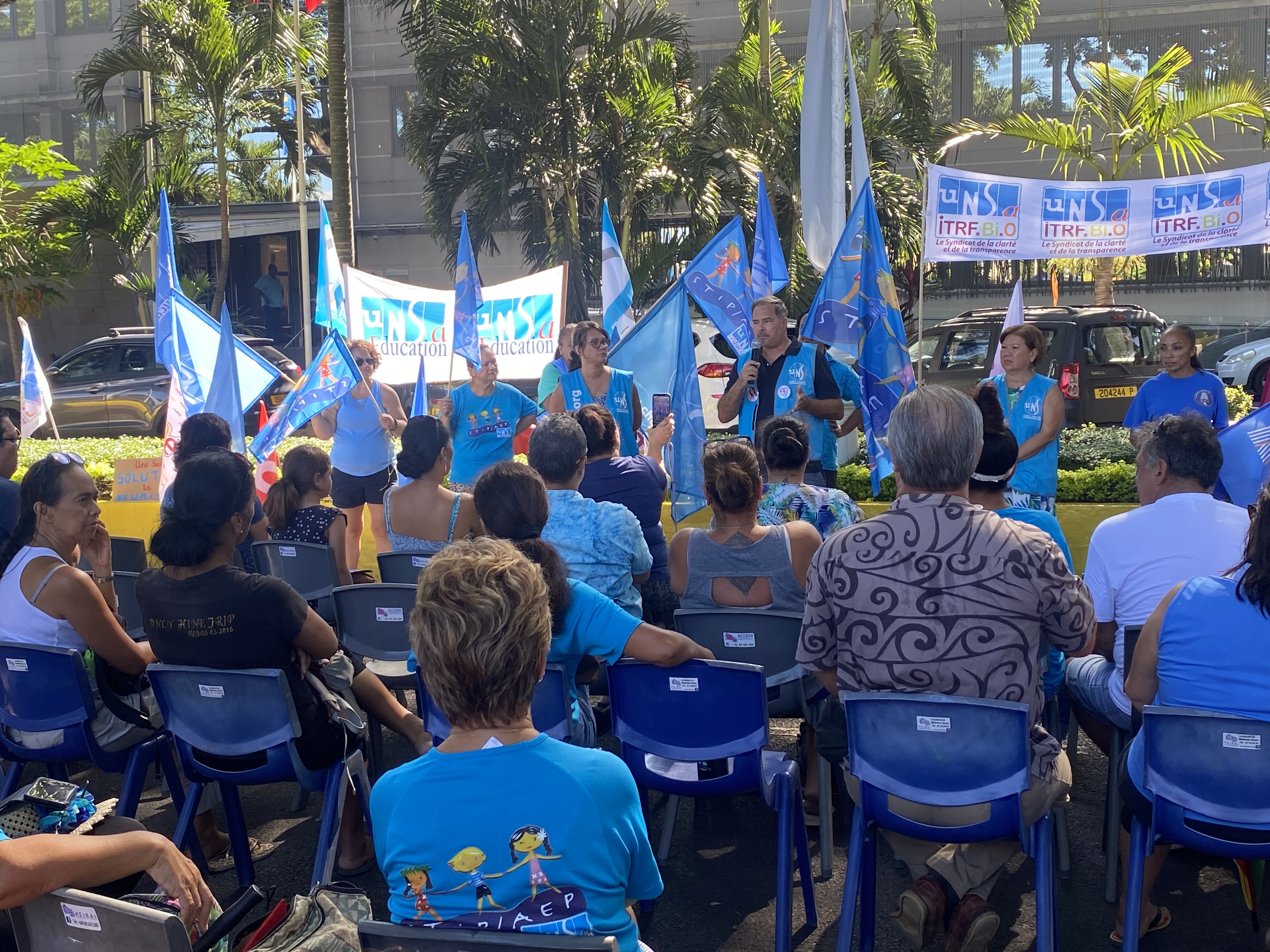 Les visages des manifestants étaient crispés, jeudi matin. Rassemblées pour un sit-in devant le monument aux morts face au haut-commissariat, les quelque 130 personnes réunies sous la bannière de l'intersyndicale des fonctionnaires d'État accusent le coup. En effet, le couperet est tombé dans la nuit de mercredi à jeudi, puisque le gouvernement d'Élisabeth Borne a déclenché l'article 49.3 de la Constitution qui a donc fait adopter d'office, sans vote, la réforme nationale des retraites. "Je suis très en colère, car je croyais à la démocratie et à ce vote démocratique qui ne se fera donc pas", s'est indignée la porte-parole de l'intersyndicale, Diana Yieng Kow, lors de la manifestation. Si cette nouvelle aurait pu ébranler la motivation de la représentante syndicale, il en est tout autre : "J'ai contacté la métropole et on est conforté par un soutien massif de l'Hexagone. On continuera à manifester suivant les directions des centrales nationales. Pour aujourd'hui, on va faire de la pédagogie avec les personnes présentes et expliquer ce qu'est le 49.3 pour qu'elles puissent le réexpliquer aux collègues qui n'ont pas pu se déplacer". Pour elle, l'usage de cet article est un "échec du gouvernement" face à la détermination des manifestants qui "n'ont pas cessé de se mobiliser" depuis presque trois mois, que ce soit en Polynésie ou en métropole. . Le taux de gréviste de ce jeudi dans l'ensemble des établissements scolaires a été enregistré à 22.93%, avec 33.66% dans le premier degré et 14.74% dans le second. Une forte hausse en comparaissant à la mobilisation de la veille où le taux global a été mesuré à seulement 7.63%. Le texte de loi, lui, va désormais suivre le chemin législatif et passer devant le Conseil constitutionnel très prochainement.