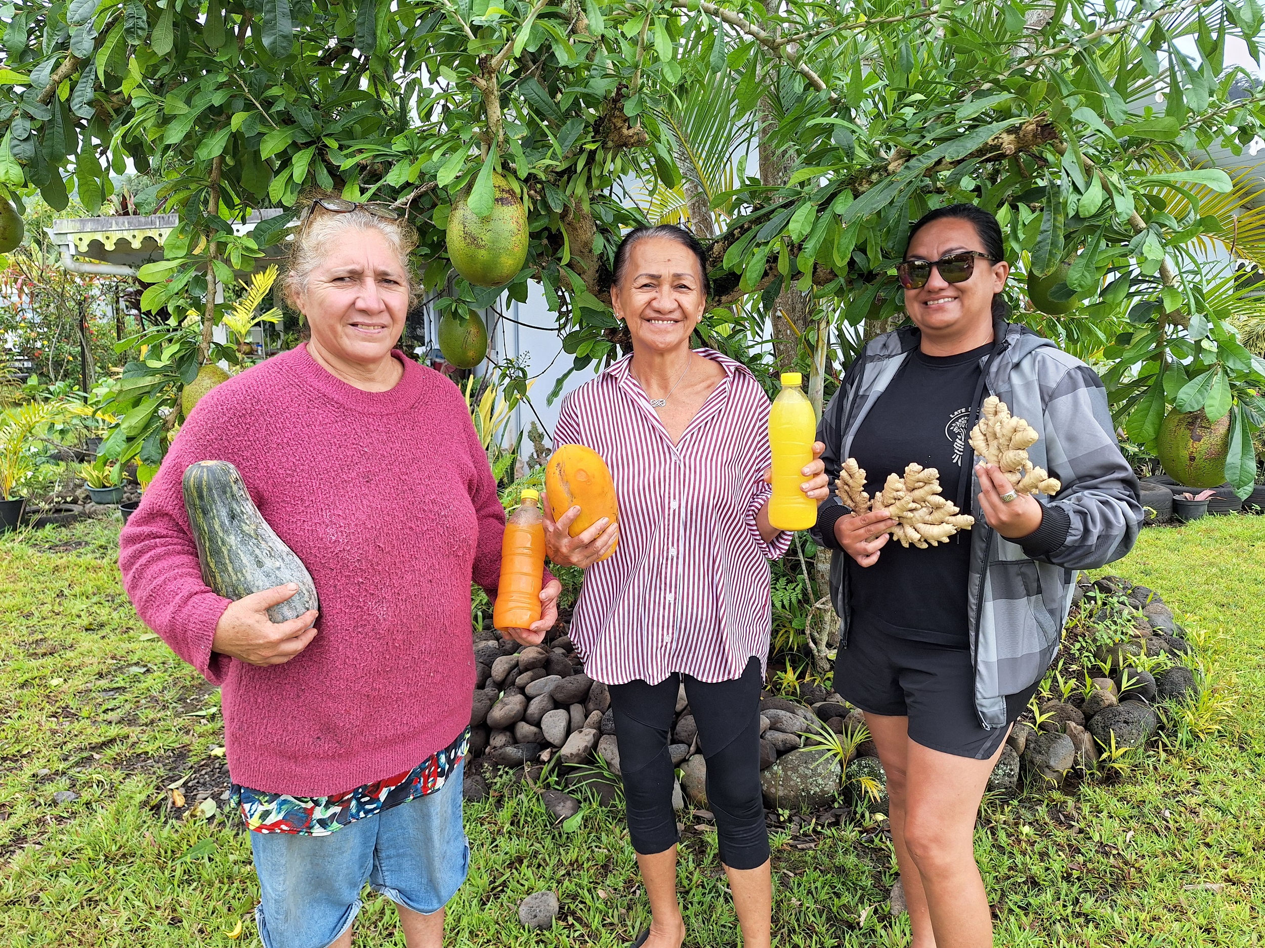 Rosina Haoatai entourée de sa petite fille, Rautea Ori (à droite), et d’Eugénie Barff, membre de la coopérative (à gauche). Crédit : Anne-Charlotte Lehartel.