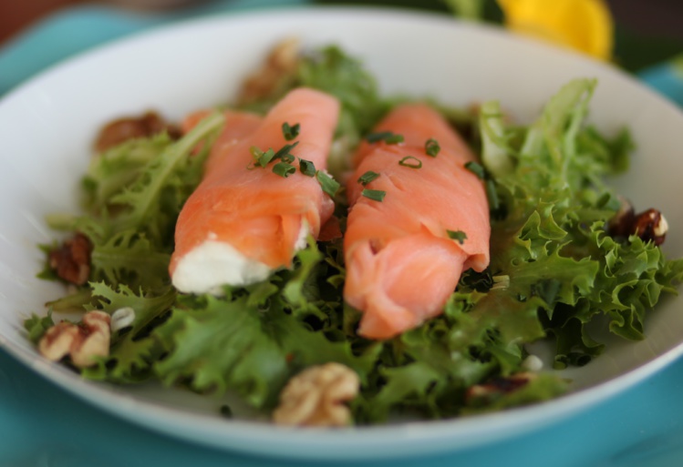 Déposer les roulés de saumon fumé sur la salade