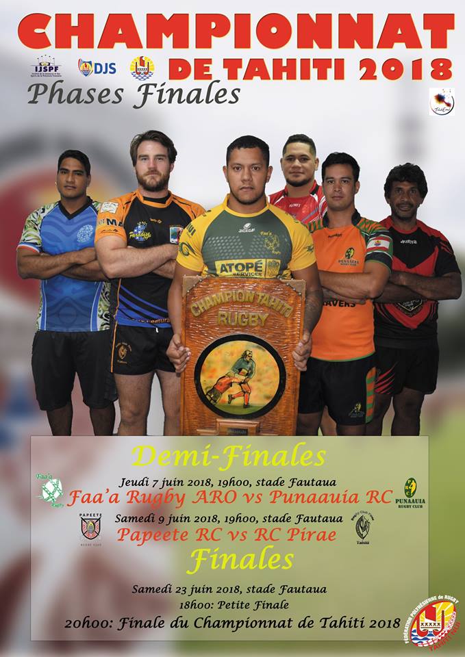 EN BREF – Les demi-finales du championnat de Tahiti 2018 de rugby à XV auront lieu jeudi (ce soir) et samedi au complexe sportif Napoléon Spitz, à Pirae. Faa’a Rugby Aro sera opposé au Punaauia RC jeudi 7 juin à 19H00 alors que le Papeete RC sera opposé au RC Pirae le samedi 9 juin à 19H00. La grande finale aura lieu le samedi 23 juin à 20H, précédée de la petite finale à 18H. Le championnat de Tahiti de rugby est proposé par la fédération polynésienne de rugby. Le tenant du titre est l’équipe de Faa’a, parviendra-t-elle à conserver son titre ? SB