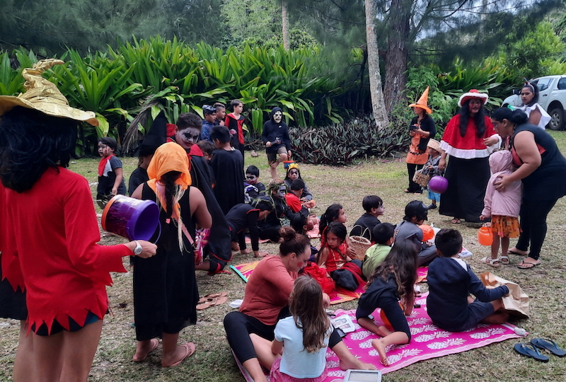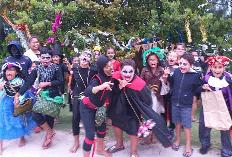 Dimanche soir à Vitaria, sur la côte ouest de Rurutu, on célébrait Halloween. Une fois n'est pas coutume, un groupe informel des riverains, dont plusieurs institutrices et animateurs, a organisé des animations pour l'occasion, une première pour les enfants du quartier.
