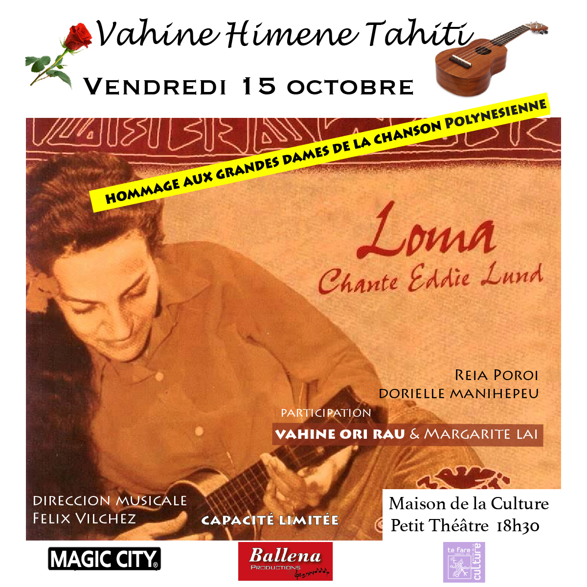 TAHITI, le 5 octobre 2021 - Le spectacle Vahine Himene Tahiti a été conçu par Felix Vilchez. Il est une version féminine de Tahiti 1917 consacré aux pionniers de la musique polynésienne. Il revient sur scène, à la sortie du confinement, pour relancer les activités culturelles, rétablir le contact humain, retrouver la joie de vivre de la belle époque. Cet événement sera animé par six musiciens, deux chanteuses ainsi que quatre danseuses dont Marguerite Lai.