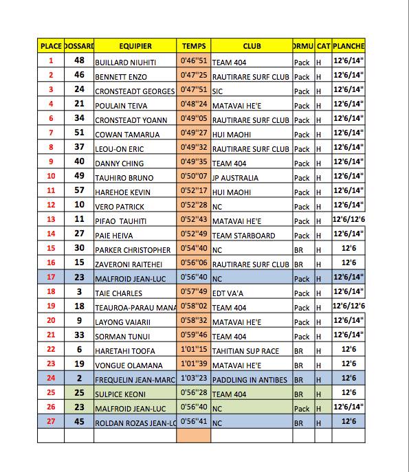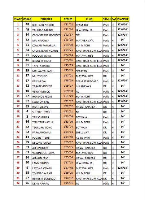 Niuhiti s’impose lors de la beach race où il termine en 1ère place devant Enzo Bennett et Georges Cronstaedt puis récidive en longue distance, subtilisant la 1ère place à Bruno Tauhiro l’ancien rameur de Shell Va’a et champion du Waterman Tour. En 3ème position, on retrouve encore le ‘King’ Georges Cronsteadt, affaibli par le chikungunya.