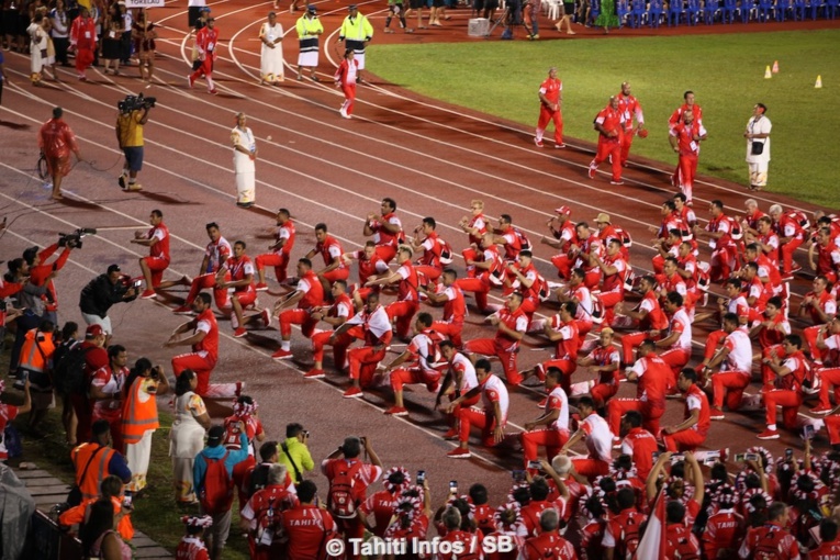 Deux portes drapeaux ont mené la délégation tahitienne. La volleyeuse Tehei Labaste et le nageur Rainui Teriipaia-Rentier. Pour leur passage les athlètes tahitiens ont effectué un haka mené par Wilson Bonno, de la sélection masculine de volley-ball et originaire des îles Marquises. "Comme toujours le haka représente quelque chose de fort", a indiqué le jeune homme. "Cela fait appel à l'esprit guerrier de chaque athlète mais aussi à l'esprit guerrier de tout Polynésien même ceux qui sont restés à la maison. Tout le monde sera avec nous lors de ce haka pour la cérémonie d'ouverture."
