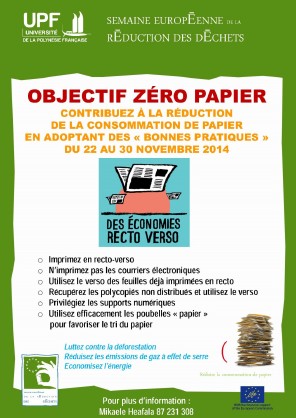PUNAAUIA, le 20 novembre 2014. (COMMUNIQUE) Semaine Européenne de la Réduction des Déchets : l’Université s’engage pour un moment fort de mobilisation éco-responsable du 22 au 30 novembre2014, campus de l’UPF