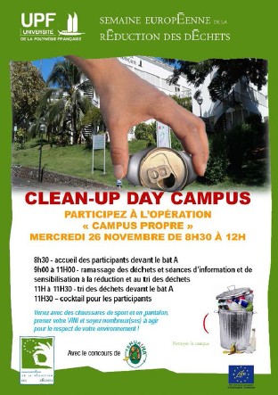 Une matinée de nettoyage des déchets dans les espaces du campus et de sensibilisation à la réduction et au tri des déchets est organisée le 26 novembre 2014 de 8h à 12h. En collaboration avec les représentantes des étudiants de la cité U, de la Société Fenua Ma et de l’ADEME, l'ensemble des étudiants, personnels et enseignants-chercheurs pourront agir pour le respect de leur environnement. Tout au long de cette matinée de « Campus propre », une sensibilisation à la réduction des déchets, au tri sélectif, au gâchis alimentaire, à l’utilisation des bacs verts, gris, bleus, rouges, au tri des déchets recyclables et non recyclables, au bon usage de la borne à piles et aux jours de ramassage des déchets par la commune de Punaauia, … sera assurée par les partenaires de l’opération.