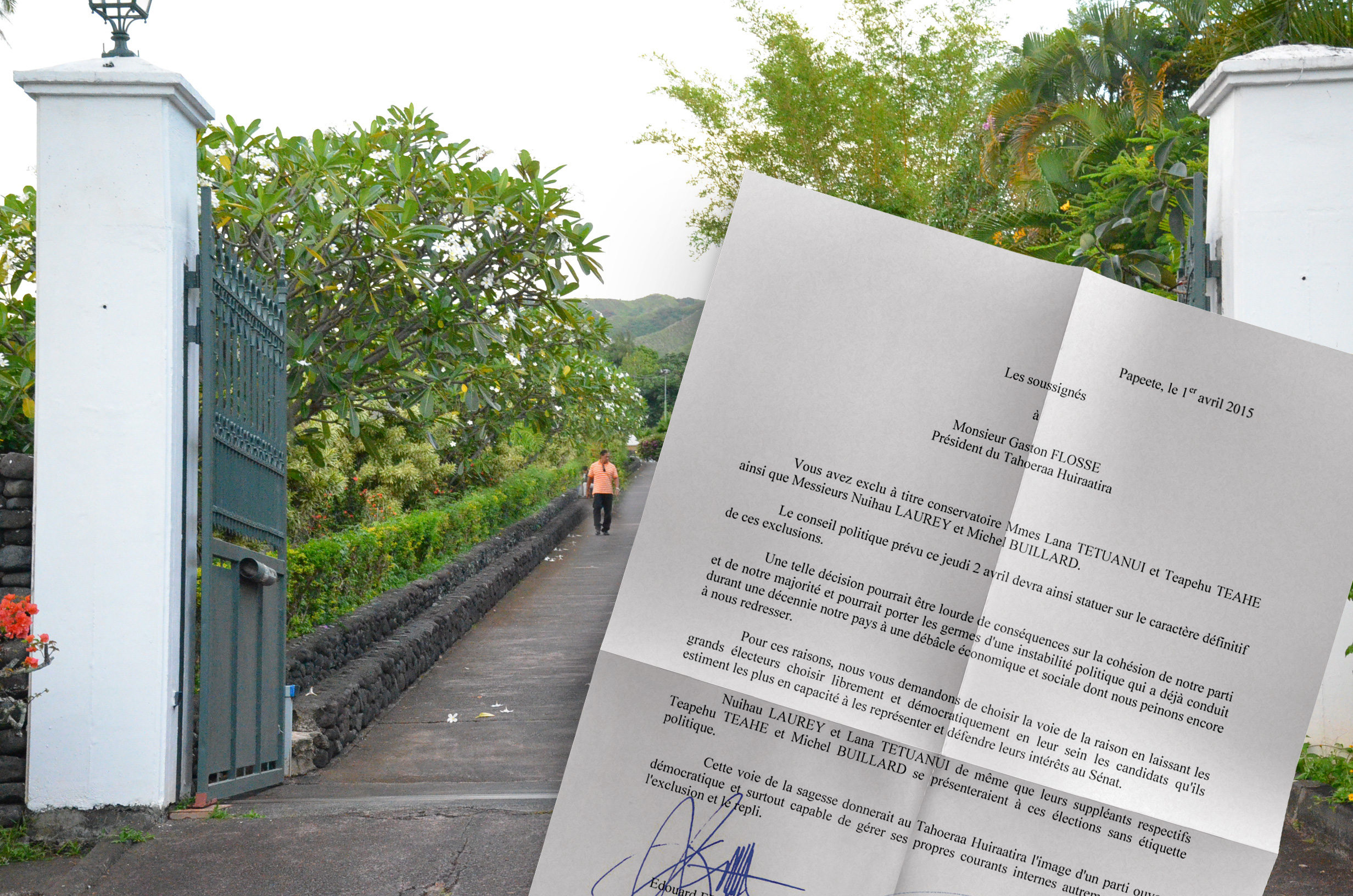 PAPEETE, 1er avril 2015 – Dix représentants du groupe Tahoera’a, les membres du gouvernement Fritch et les députés Tuaiva et Sage signent une lettre de soutien à Nuihau Laurey, Lana Tetuanui et leurs deux suppléants, menacés d’exclusion par les instances du parti. "Une telle décision pourrait être lourde de conséquences sur la cohésion de notre parti", préviennent-ils.