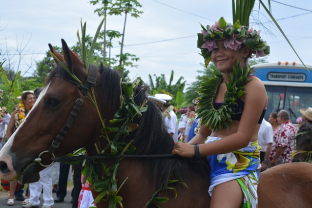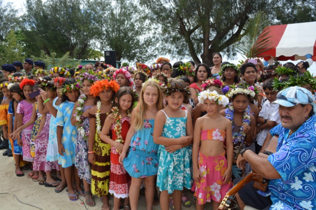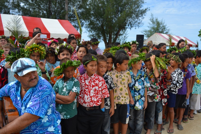 TUBUAI, le 10 mars 2015. La ministre des Outre-mer est sous le charme de l’accueil polynésien et tout particulièrement de celui qui lui est offert dans son déplacement par les enfants. A plusieurs reprises lors de ses visites, George Pau-Langevin a félicité les enfants de leurs prestation en chants, en danse ou en orero qui lui ont été offerts à son arrivée sur les différentes étapes au point que c’est à eux principalement qu’elle a adressé ce mardi après-midi son discours sur le parvis de la mairie de Mataura après leur interprétation de l’hymne polynésien et de la Marseillaise. « Je vous remercie pour la qualité de votre accueil qui m’émeut à chaque fois : vous êtes tellement sages et tellement chaleureux à la fois. Lorsque vous les enfants vous réussissez à l’école c’est bien pour vos parents et pour votre collectivité car vous êtes l’avenir de Tubuai et de la Polynésie française. Quand on se promène à travers les outre-mer on ne peut qu’être émerveillés de la façon dont on peut allier le respect des traditions et des cultures avec les valeurs éternelles de la République ».