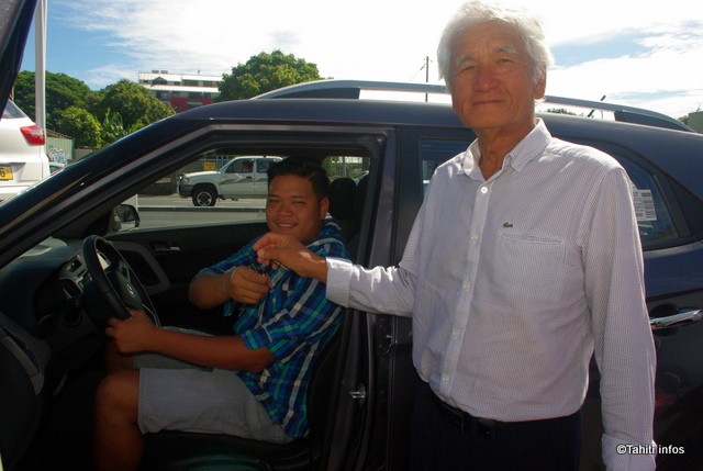 Ariimanarautaumaiterai Wang Cheoui reçoit les clefs de sa voiture des mains d’Albert Moux