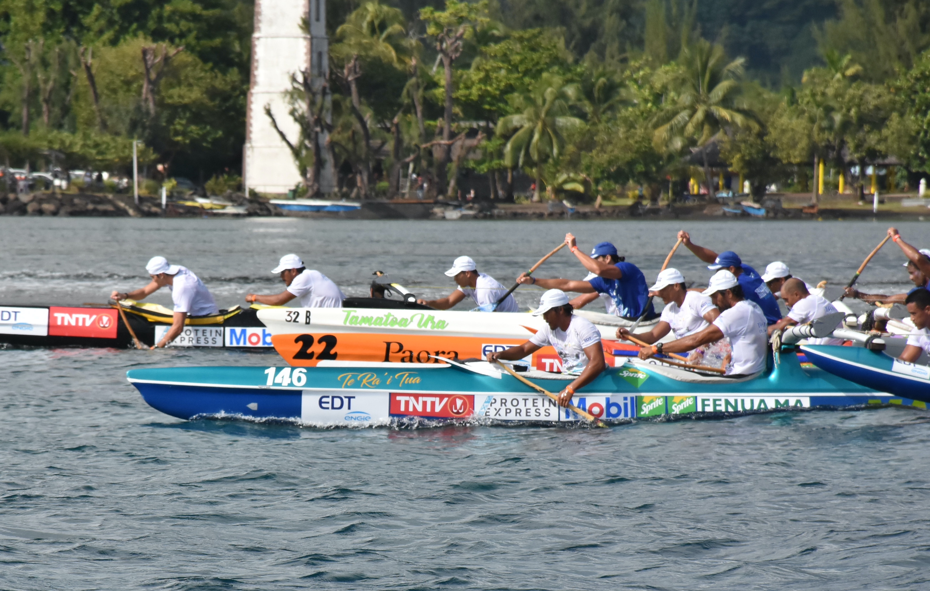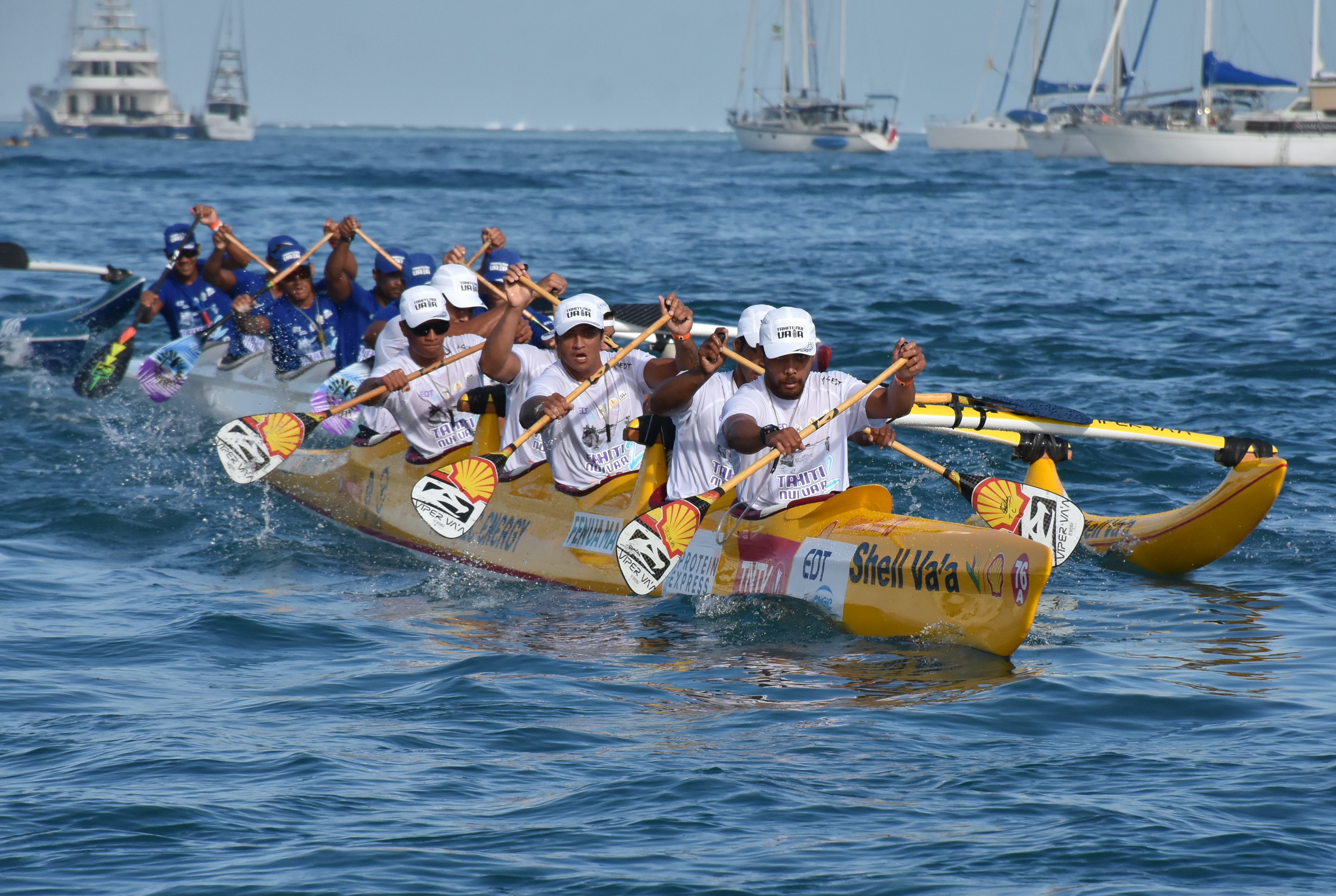 Et au bout de 25 minutes de course, les premiers équipages franchissaient la passe de Papeete pour s'attaquer à la longue remontée vers Papenoo, avec Shell Va'a toujours en tête au contact avec EDT Entreprise. Dans leur sillage Pirae Va'a et la pirogue sénior des électriciens. Manihi Va'a, Mataiea Va'a étaient plus décrochés et le Team OPT pour sa part entamait déjà sa belle remontée. Les premiers changements sont ensuite intervenus.