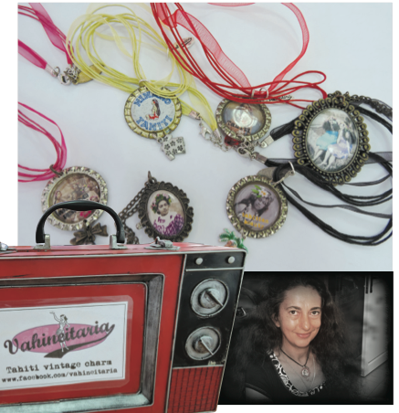 Silvia travaille dans le tourisme, mais pendant son temps libre, elle confectionne des bijoux en utilisant les clichés anciens qu’elle customise sur photoshop . Elle a créé une collection vintage qui fait fureur. A la rédaction, nous avons particulièrement aimé les pendentifs réalisés à partir de capsules de Hinano dans lesquelles elle a logé des photos retouchées. Elle réalise aussi des boucles, des bracelets, des sautoirs, des montres bijoux…